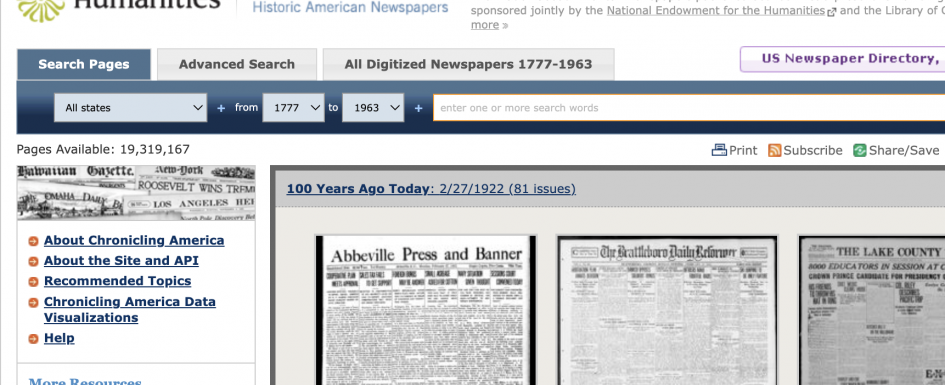 This exercise will ask you to explore a digitized newspaper archive. You will learn about how it was created, how it can be searched, and you will experiment with different keyword searches to find relevant materials. The directions below will walk you through the exercise. You will need a computer with an internet connection and 20-30 minutes to complete the work.